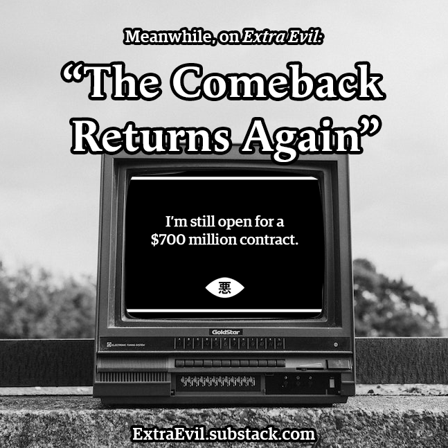 by: Dennard Dayle (Blind Monkey)Posted on: December 13, 2023December 19, 2023 Extra Evil – The Comeback Returns Again Reading my newsletter cools the planet. Share this:Share Share on X (Opens in new window) X Share on Reddit (Opens in new window) Reddit Email a link to a friend (Opens in new window) Email Share on Facebook (Opens in new window) Facebook
